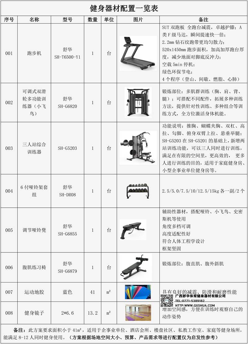 此方案要求面积小于41m²,适用于企事业单位、酒店会所、楼盘社区、私教工作室、家庭等健身场所,能满足8-12人同时健身使用。(方案根据场地空间大小、预算、产品需求等进行配置仅为启发性参考)