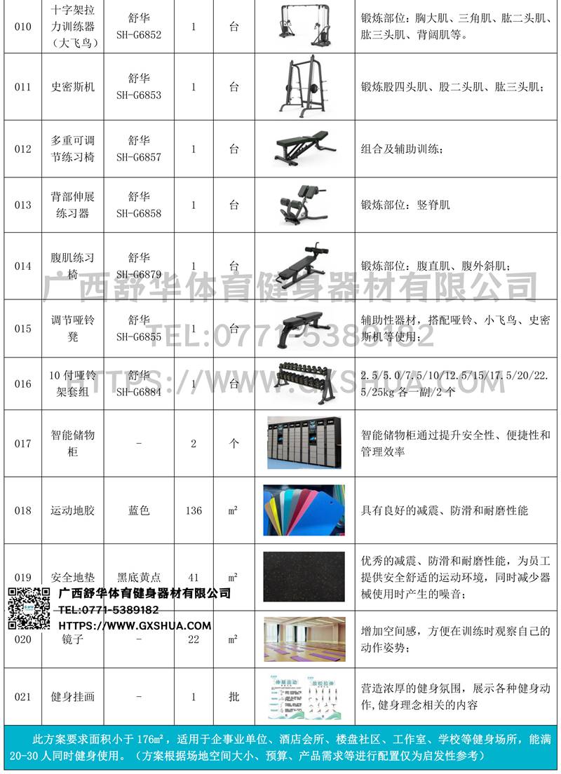 此方案要求面积小于176m²,适用于企事业单位、酒店会所、楼盘社区、工作室、学校等健身场所,能满20-30人同时健身使用。(方案根据场地空间大小、预算、产品需求等进行配置仅为启发性参考)