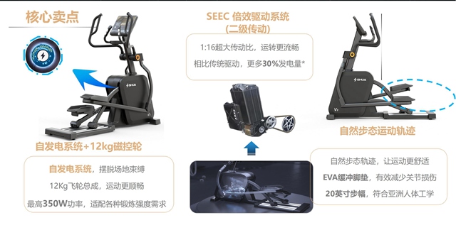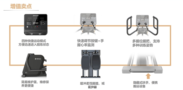 安全稳重,细节制胜。壹号娱乐V8椭圆机是一款高安全系数的椭圆机,整体设计遵循人体工学科学,缓震踏板中添加减震层设计,能够有效减少运动冲击带来的关节损伤,且最大支持160kg载重,满足更多人群。手握心率监测、多功能置物架、自发电系统取代统电源......在细节上,新款椭圆机站在健身者角度,添加了不少设计者的巧思,为健身者带来更贴心的体验。